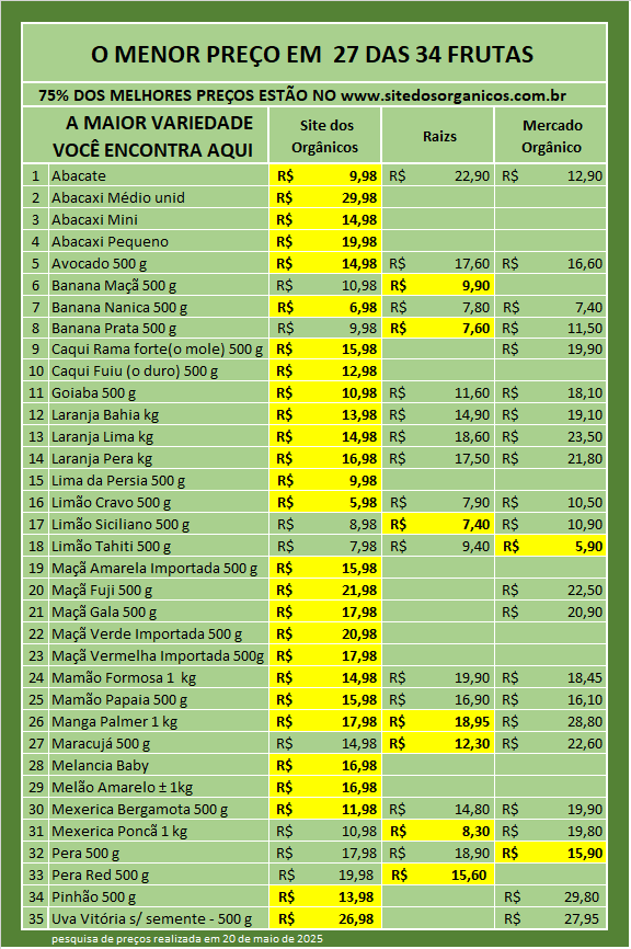 O MENOR PREÇO EM 27 DE 34 FRUTAS