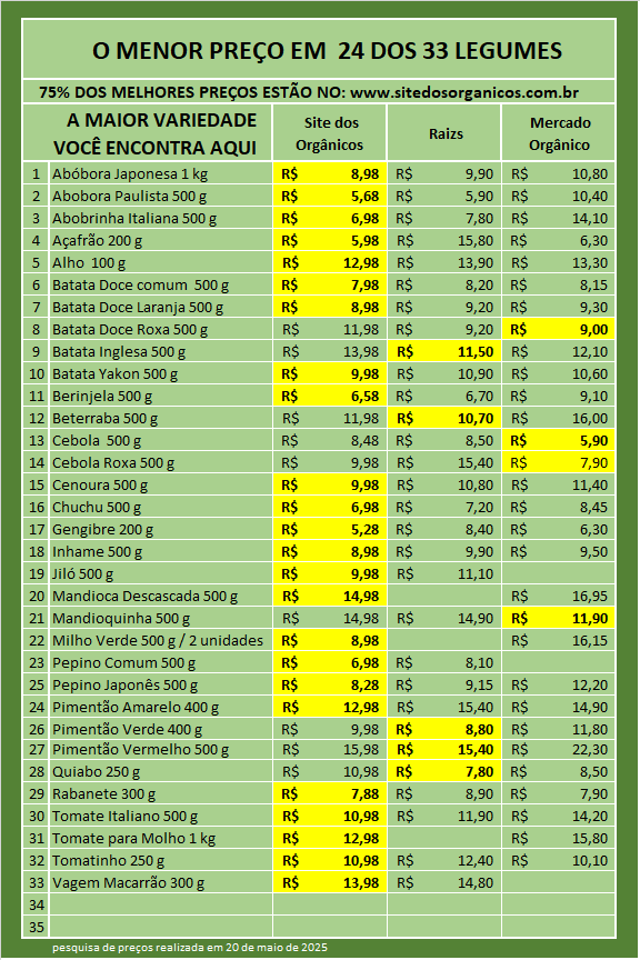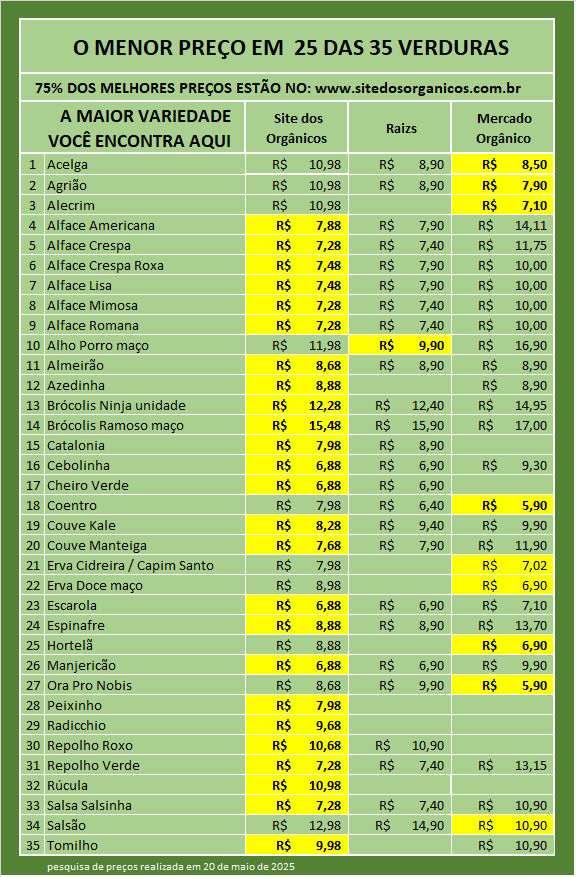 O MENOR PREÇO EM 25 DE 35 VERDURAS